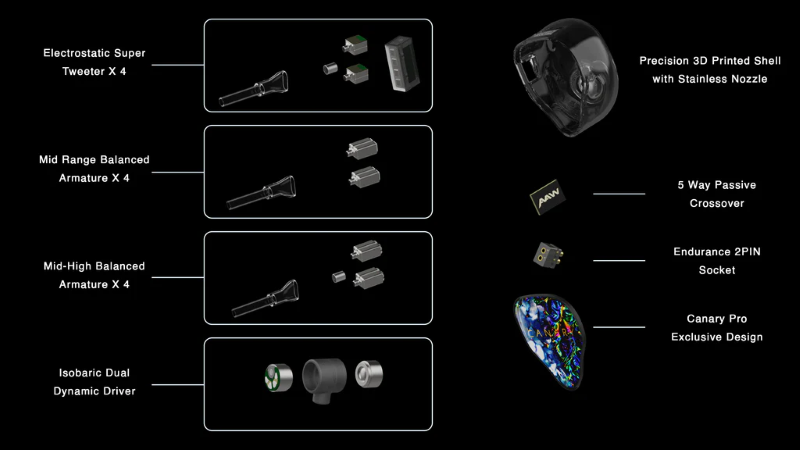 Canary Pro's 14-driver matrix represents the pinnacle of hybrid in-ear monitoring architecture design. It was developed and enhanced based on our acclaimed hybrid system to address coherence and phasing issues that are common when fusing dynamic driver with armature drivers. To achieve this, Canary Pro's EMDM system features a dedicated 3D-printed acoustic chamber to house the isobaric dual dynamic drivers and reshape their characteristics. In addition, the 5-way passive crossover design configures each driver to perform optimally within its designated frequency range, resulting in minimal scrambled phase shift and interference.