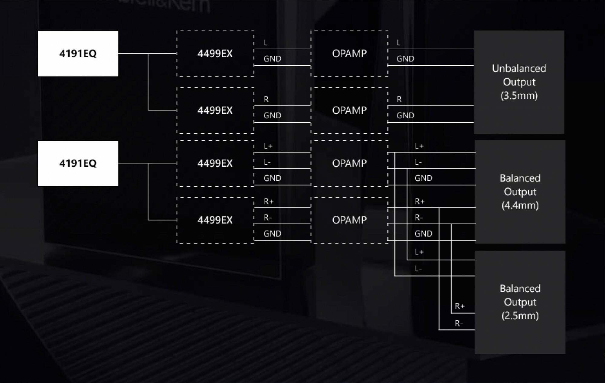 Unbalanced Out 3.5mm (0.8ohm) │ Balanced Out 2.5mm (2.0ohm), 4.4mm (1.8ohm)