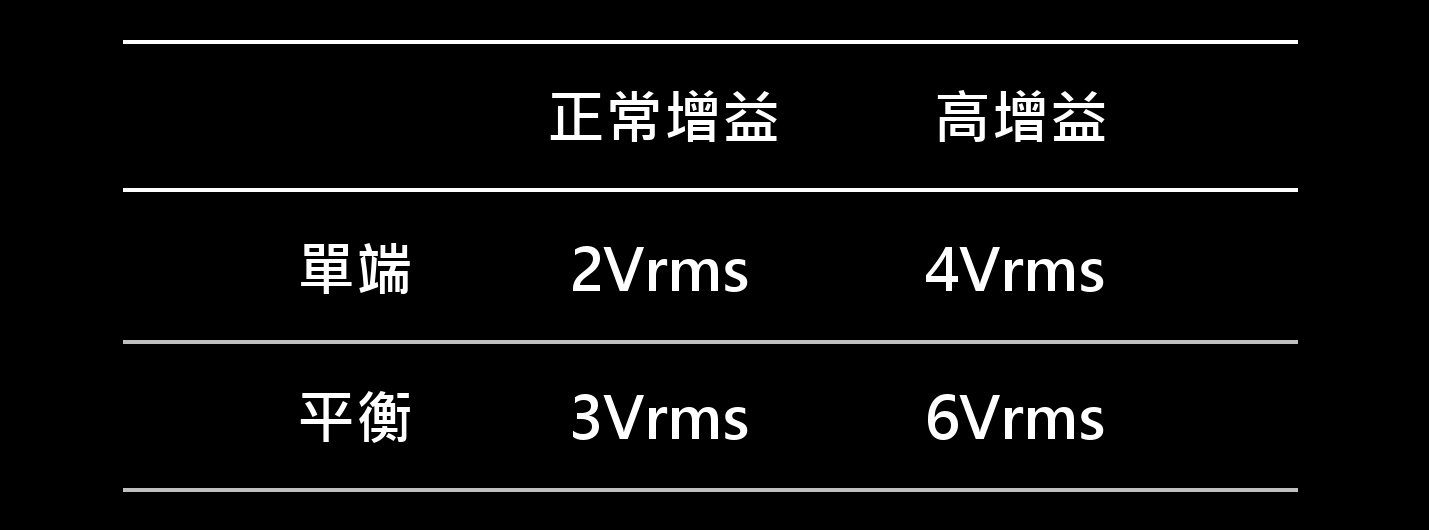 [高增益] 單端 3Vrms / 平衡 6.0Vrms(無負載)
