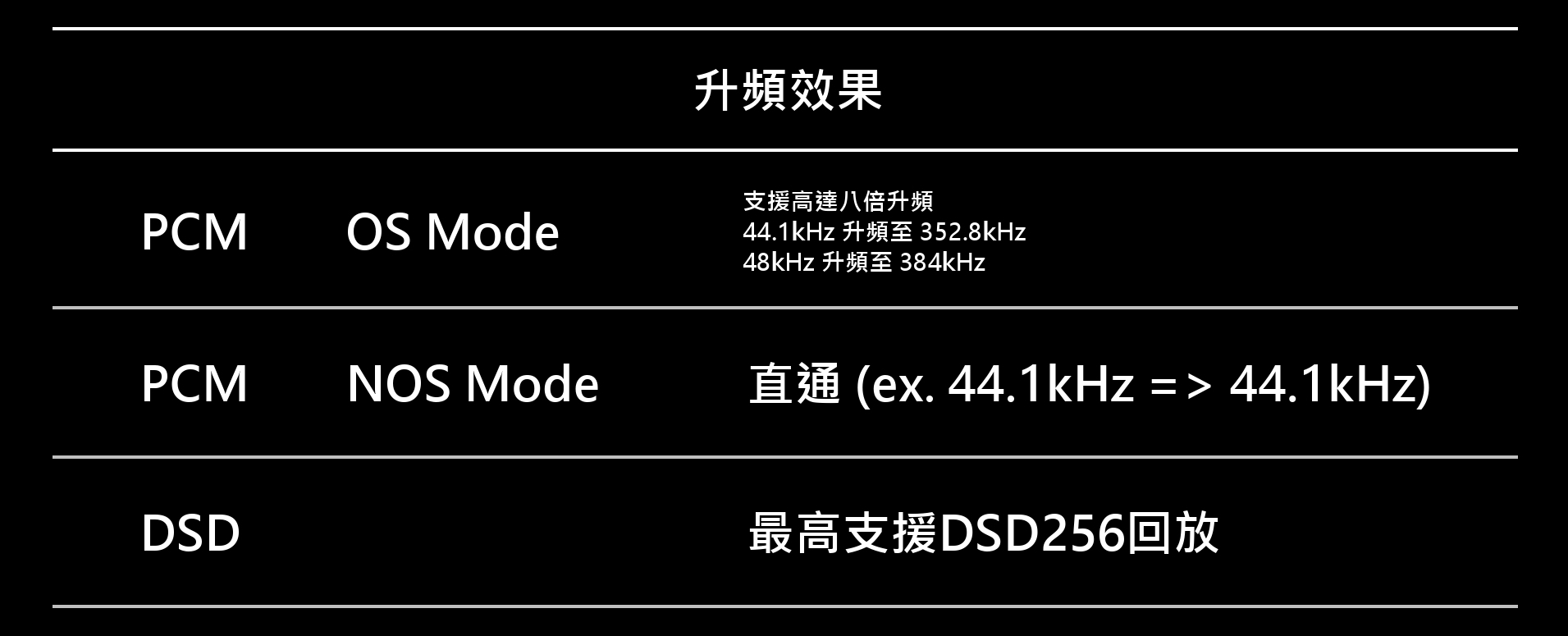 DSD : DSD64(1bit 2.8MHz), Stereo / DSD128(1bit 5.6MHz), Stereo / DSD256(1bit 11.2MHz), Stereo