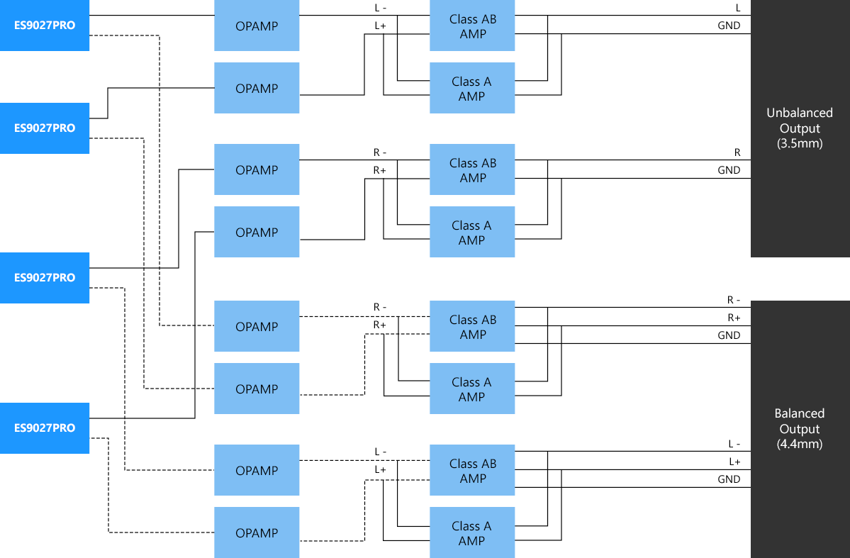 PD20 秉持對音質的極致追求,核心電路採用了 4 顆 ESS ES9027PRO 晶片組成的 Quad DAC 架構。透過 4 顆 DAC 獨立運作,能將聲道間的干擾降至最低,實現精確的訊號分離。這不僅能鮮明地還原聲音中最細微的韻味,更透過純淨且無失真的層次堆疊,創造出自然且富有模擬(Analog)質感的音質。