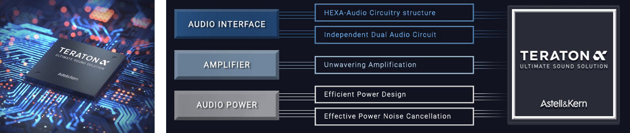 機身內嵌了由 Astell&Kern 研發、將主要電路整合為一的終極音訊解決方案——「TERATON ALPHA」。透過有效的電源雜訊消除、高效的電力管理,以及極低失真的訊號放大,TERATON ALPHA 確保了音訊輸出介面能實現極致接近原音的重播。這項 Astell&Kern 的獨家技術,是經過數萬小時不間斷的研究開發而成,旨在完美還原藝術家與製作人所追求的原始聲音。