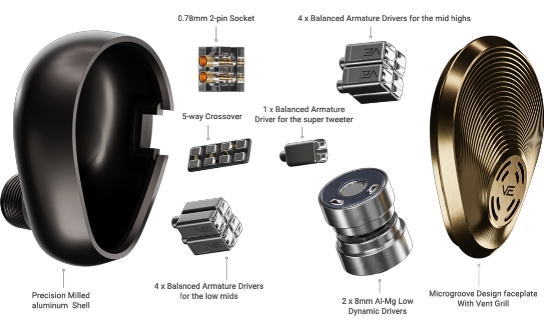 它帶有特別選擇的四個中低動鐵單元和四個中高動鐵單元以及兩對雙動鐵單元,它們結合起來處理中高頻範圍。精心挑選的八位動鐵單元共同創造精準的中音,並產生溫暖而動人的男女聲。