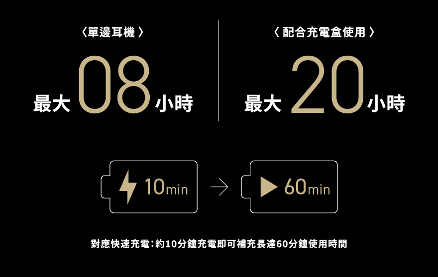 耳機本體單獨使用可達最長8小時*,如果搭配充電盒使用,最長更可達20小時的長時間播放。 此外,TE-ZX1 還支援快速充電功能,只需充電10分鐘即可使用最長60分鐘,無需擔心電池問題。