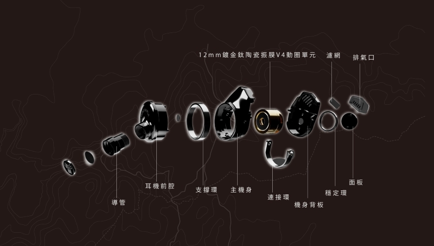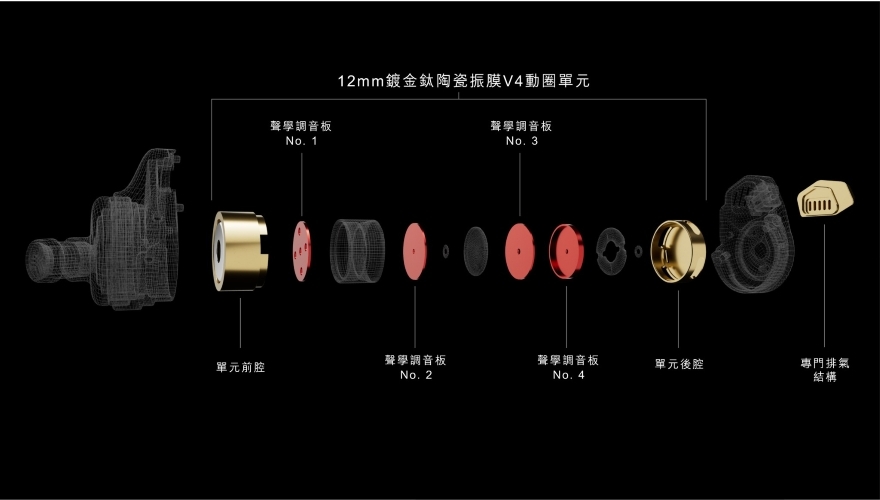 在 Ventura 所搭載的12mm鍍金鈦陶瓷振膜V4動圈單元上,品牌不但應用黃銅作為單元外殼,提供良好的諧振抑制性能同時,共鳴出暖潤的音色表現。更為了加強動圈的內部氣動量,塑造出更優秀的空間感和低頻。便特意為單元設計出9mm的體積,亦分別從單元的前腔以及後腔,加入合共四層的聲學調音板,調控內部氣流,使單元的音色表現可以符合對於動圈的自然度、銜接連貫性的別注追求。