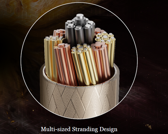 Enigma (謎音)採用了三重混合導體結構,特別定製了銀鍍鈀、銀鍍金和單晶銅三種不同特性的頂級導體,當中更採用 Eletech 旗艦級的9x9幾何混合編織法,,再加入銅鍍銀屏蔽網處理,大大增強了音場、聲音密度、分離度以及兩端延伸等方面,以及提供更寧靜的音樂背景。
