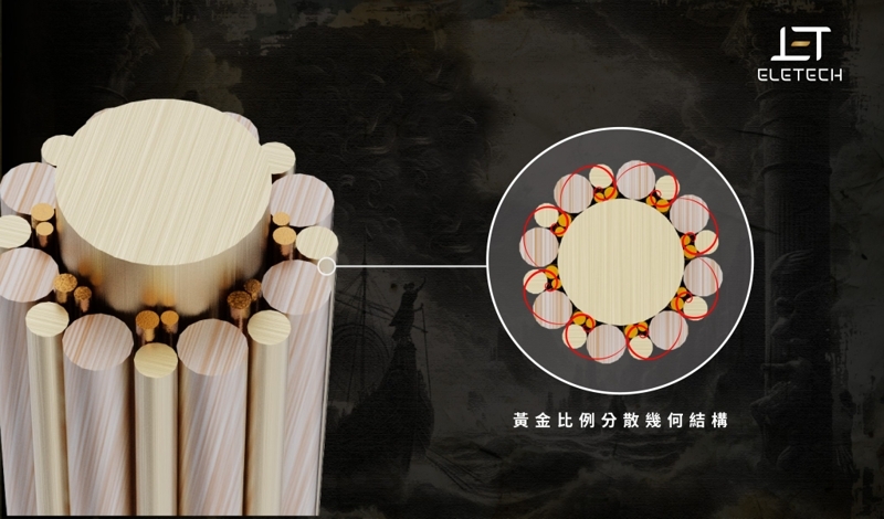 Eletech研發出以建築學當中的黃金比例(1:1.618)為基礎的分散幾何結構,能夠精妙分配三種導體(金銀合金、金銅合金、銀銅合金)的空間、線芯粗細與排列次序。此設計確保線股間距與分佈符合黃金比例,最大化空間利用率,減少電流分佈不均,顯著降低集膚效應,提升訊號傳輸效率。黃金比例的幾何排列不僅增強線材的物理穩定性,能夠降低訊號傳輸的損耗,顯著地提升音場的立體感與微細節還原能力。每條線芯均經獨立絕緣處理,有效屏蔽電磁輻射與外部無線訊號干擾,呈現純淨深邃的音樂背景。