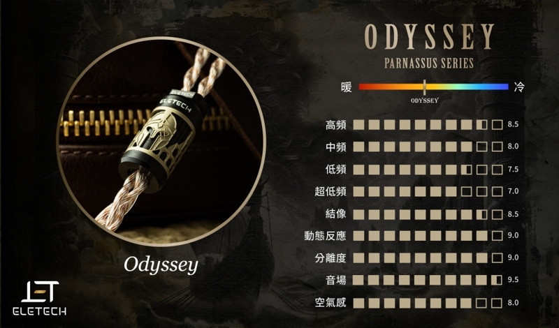 由於Odyssey承襲了 Eletech 旗艦級線材的優勢,無論是音場拓展與瞬態反應上的表現都是在市場上擁有超班的表現。此外,Odyssey能夠充分地展現從容不迫的控制力,音場開闊綿延,樂器與人聲之間的定位層次分明,細膩的動態變化猶如輕描淡寫的筆觸,勾勒出音樂的靈動之美。其中頻溫潤飽滿,人聲情感細膩動人,低頻瞬態快速且具下潛深度,呈現如絲絨般柔順的質感,讓每一段旋律流動自如。