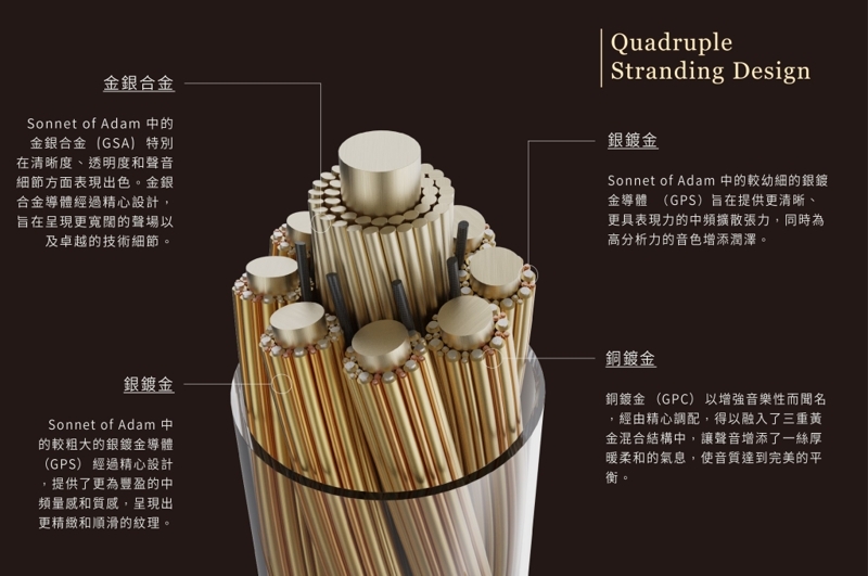 線材中的金銀合金 (GSA) 特別在清晰度、透明度和聲音細節方面表現出色。金銀合金導體經過精心設計,旨在呈現更寬闊的音場以及卓越的技術細節。而當中較幼細的銀鍍金導體(GPS)旨在提供更清晰、更具表現力的中頻擴散張力,同時為高分析力的音色增添潤澤;較粗大的銀鍍金導體(GPS)經過精心設計,提供了更為豐盈的中頻量感和質感,呈現出更精緻和順滑的紋理。銅鍍金(GPC)以增強音樂性而聞名,經由精心調配,得以融入了三重黃金混合結構中,讓聲音增添了一絲厚暖柔和的氣息,使音質達到完美的平衡。