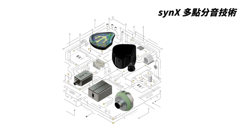 Empire Ears 擁有耳機產品中最複雜、最先進的分音技術「synX」,支援廣闊的頻率範圍,精密設計能夠消除一般多路分音器容易出現的相位失真,將聲音訊號準確地輸送至各個頻段的單元,使聲音暢順銜接,synX 具有高訊噪比、低失真的優點,清晰細緻地將音樂重現 。