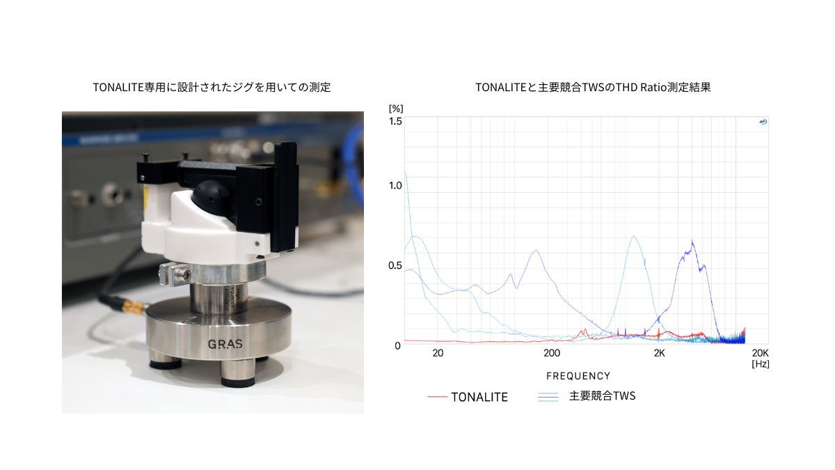 透過全新設計的單元、腔體與調音策略,TONALITE 在真無線耳機領域中達成了 史上最低級別的總諧波失真(THD)。其失真曲線於全頻段內極度平坦,接近理想的「直線」,尤其在一般耳機最難控制的 極低頻段,依然維持驚人低失真表現。