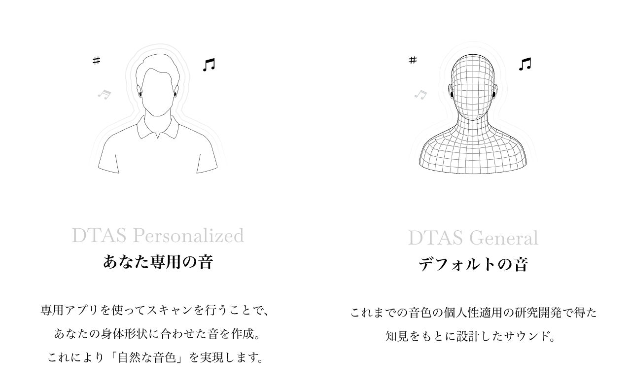 相對以手動調音的傳統做法,D.T.A.S 選擇以最直接及科學的解決方法,讓耳機發出的聲音能重新加入個人身體、頭部,及耳朵形狀對聲音的影響,告別手動調音「染色」,聽見專屬音樂「本真」。就似是針對每個人不同的視力差異訂制一副眼鏡,讓你能由根本對焦看清圖像。