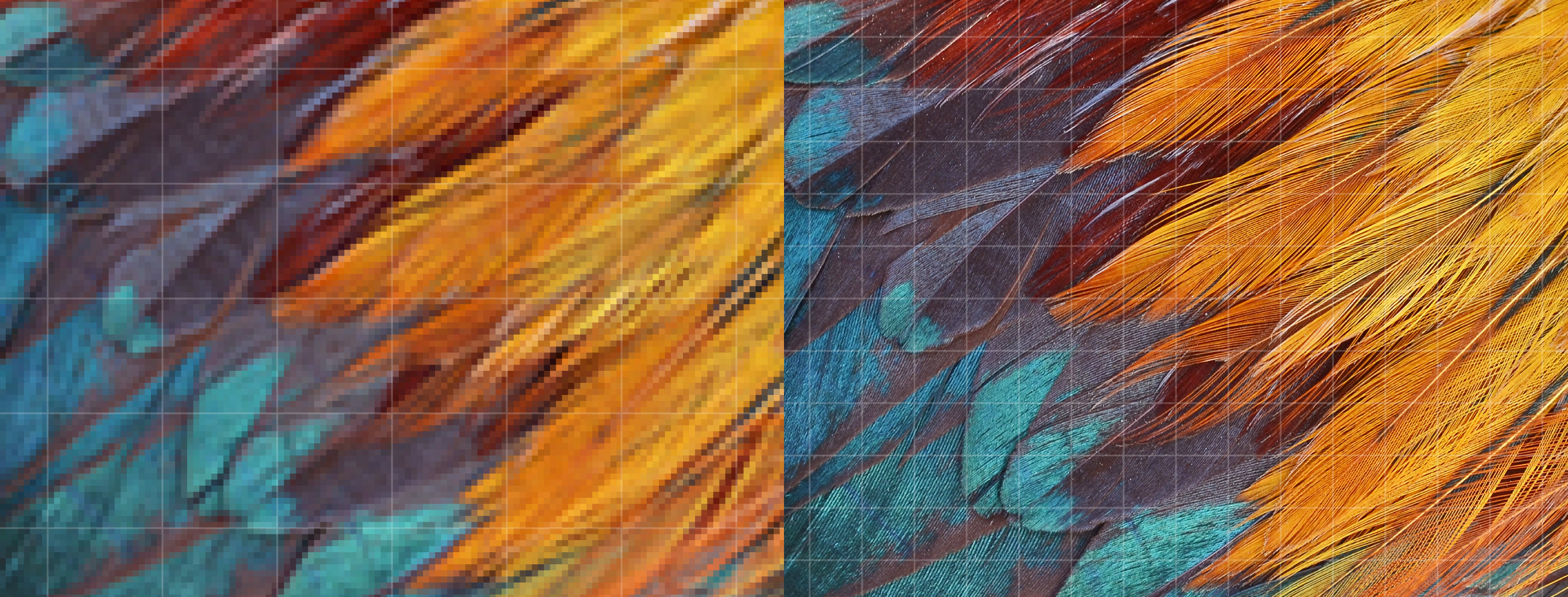 8K被稱為最新一代高像素畫質的視覺效果。8K影像以高清晰度顯示信息,甚至可以清楚地看到人物肌膚表面細紋。在以往的規格中,會通過強調輪廓等處理來營造高清效果,然而8K影像的像素數是標準的16倍,大量影像信息資訊量直接提高了影像的畫質,無需再通過各種處理來營造高清效果。