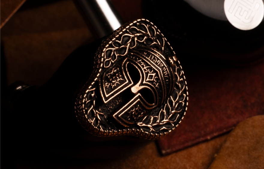 在設計上,除了在面板上雕刻出立體且精細的頭盔圖案外,還巧妙地融入了樹根圖騰,象徵圓桌騎士團成員之間的忠誠與深厚的羈絆。最後,為了增強耳機的立體感和設計精細度,於面板上添加了黑色琺瑯塗層,進一步突顯其高端的視覺效果和細膩的工藝。