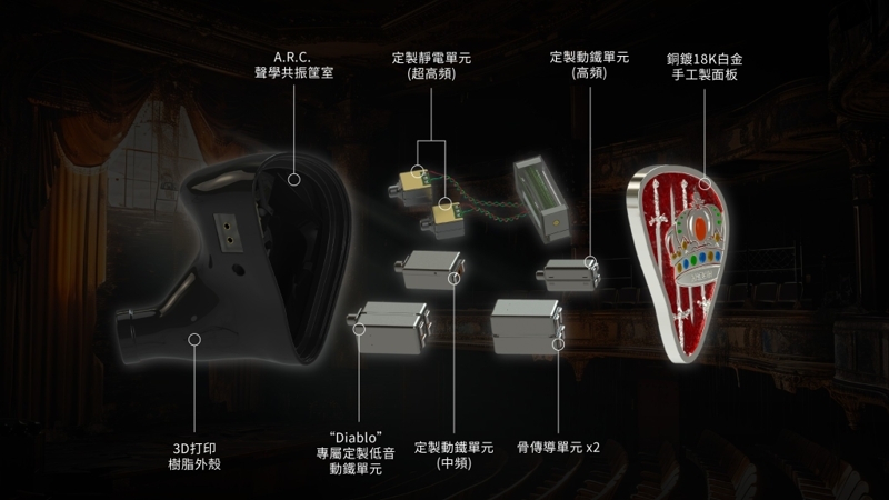為了能夠忠實再現歌劇和音樂劇的精髓和戲劇張力,捕捉表演者所傳達的每一個細微差別和情感,Macbeth建基於靜電、動鐵以及骨傳導單元的三混合單元架構,採用特別研發的「Diablo低音動鐵單元」,並且加入獨家的「F.C.R.電路中繼系統」,將其融入至專屬「A.R.C.聲學共振筐室」當中,將各單元的輸出調整到最佳狀態。讓發燒友仿如置身於歌劇院中,享受兩聲道音效般的臨場立體感以及極緻音質體驗。