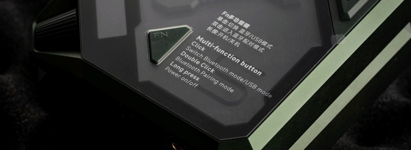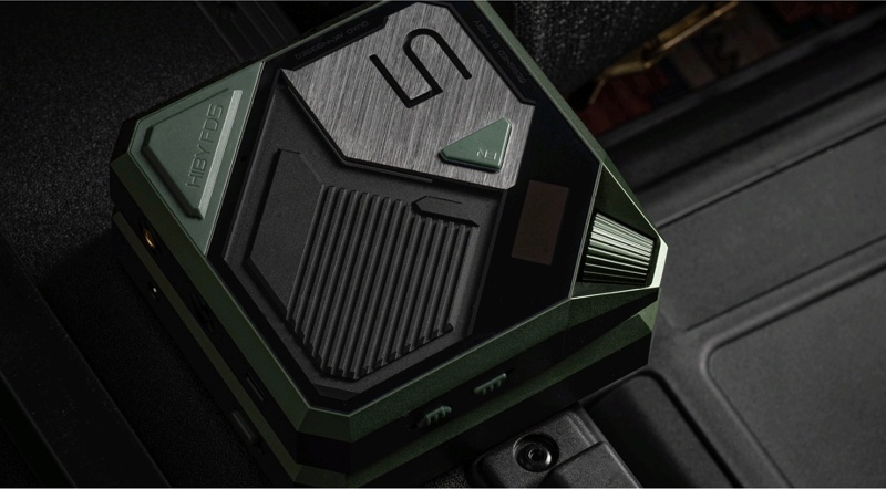 鋁合⾦外殼加上玻璃⾯板,滲修cyberpunk元素,彩⾊顯⽰屏隨狀態切換顯⽰,⾯板上亦配有採樣指⽰燈設計。100級實體硬件⾳量調節旋鈕,精準控制⾳量,⼿感優秀。