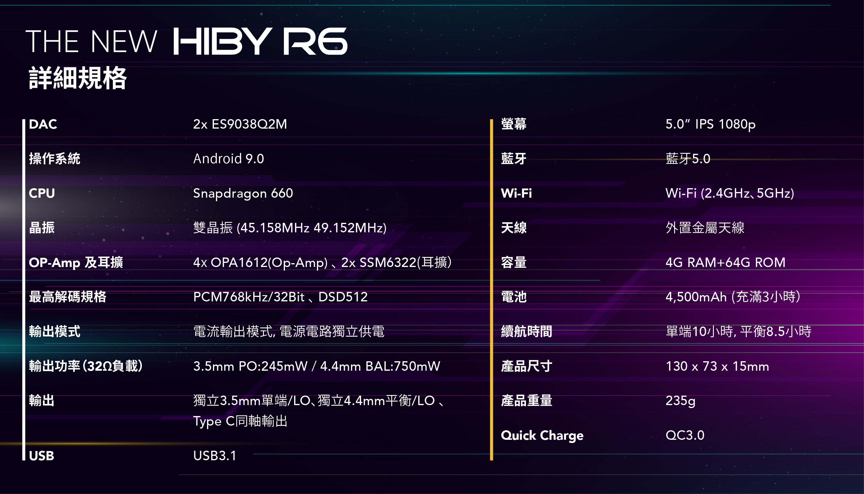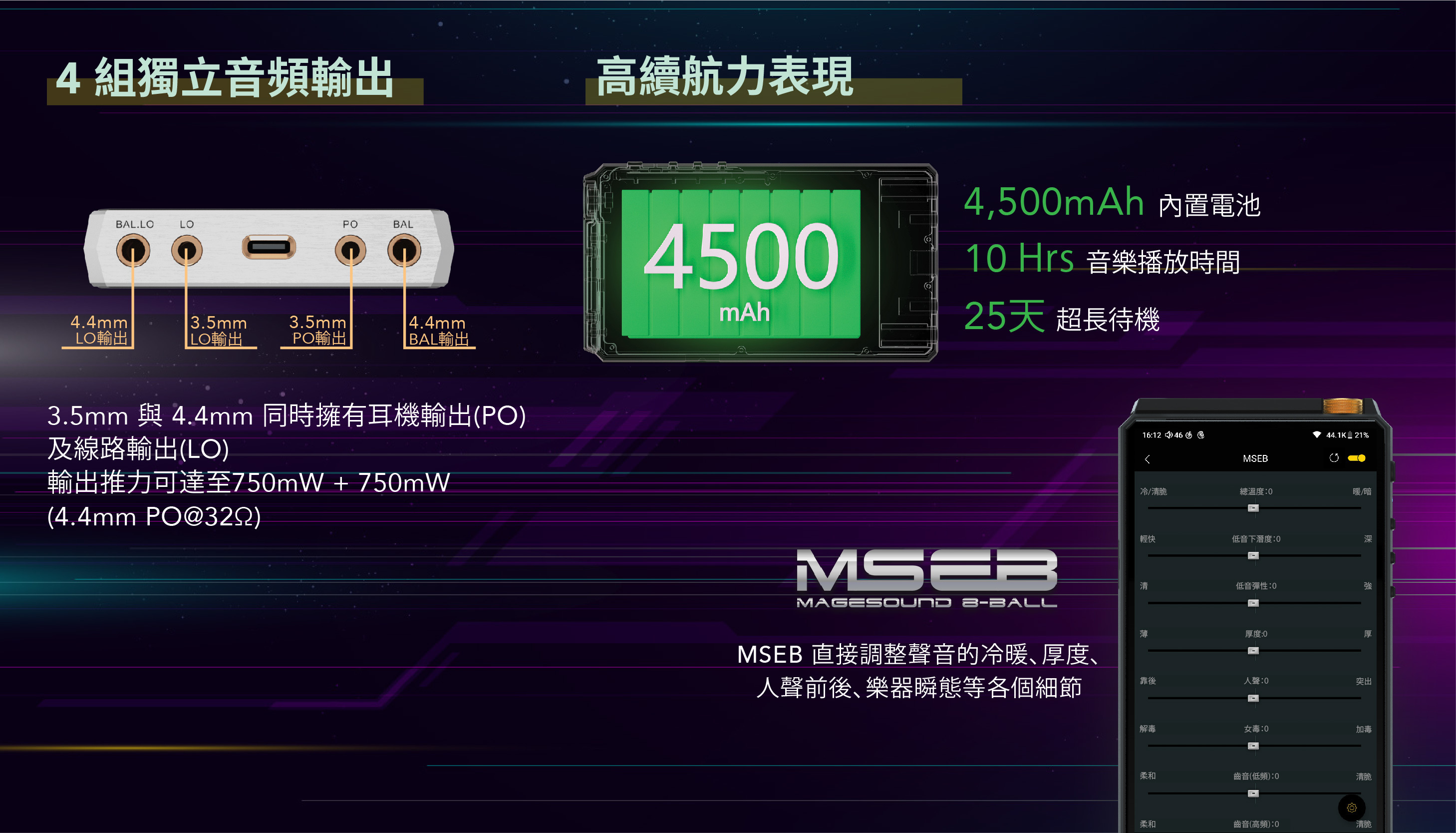 輸出功率:4.4mm PO(750mW@32Ω)、3.5mm PO(245mW@32Ω)