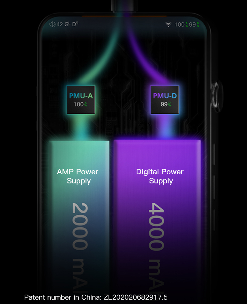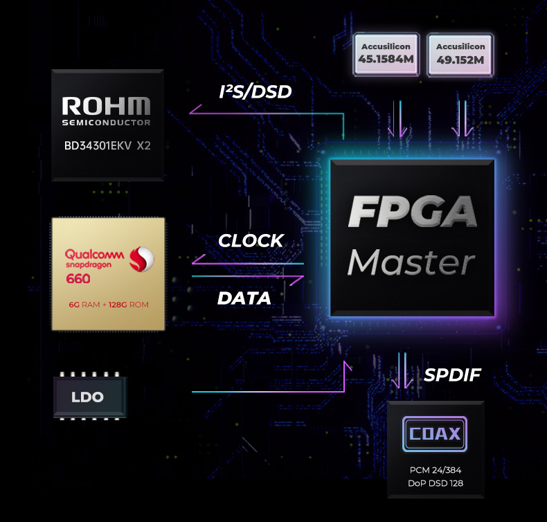 雙羅姆BD34301EKV│自研FPGA-Master技術 | 專利雙電池架構 | 數位耳放分離供電 |高通驍龍660 SoC | 6G RAM+128G ROM | Android11 | Mango OS純音系統 | 可換耳放卡設計 | 6.5英寸全面屏 │ 最大輸出電平7.1Vrms (1200mW@32Ω) | Accusilicon飛秒晶振