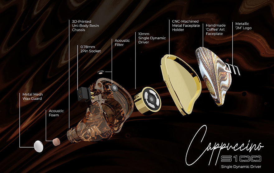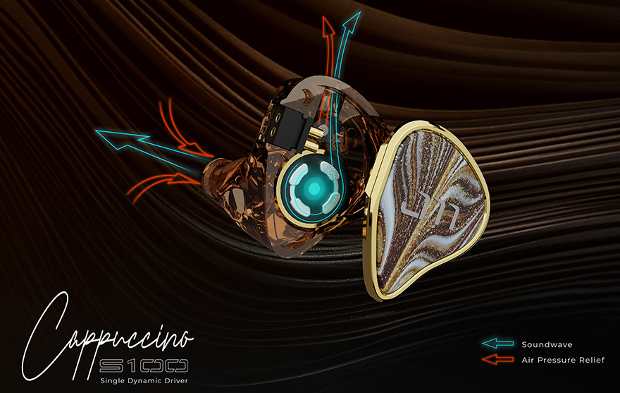S100 Cappuccino 採用高性能全頻 10mm LCP 液晶振膜單動圈設計,令聲音保真度及分析力提升。同時更首次用上獨家的雙諧波氣動腔體 (DHAC) 技術,使不必要氣壓可以通過 DHAC 外殼釋放,令音場更為廣闊,更具空間感,讓你一戴上就猶如置身於咖啡店聆聽輕鬆音樂。