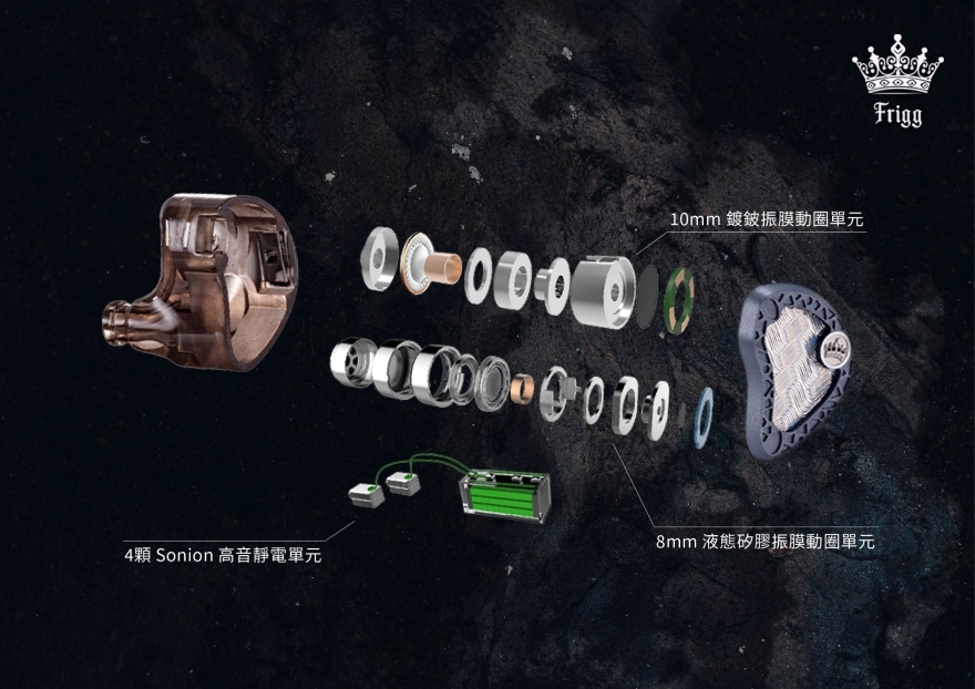 Frigg 捨棄了傳統動鐵單元作為中頻過渡的方案,採用全新「2動圈 + 2靜電」的混合架構。低頻與中頻分別由兩顆不同材質的頂級動圈單元獨立驅動,旨在還原最自然的樂器質感與人聲厚度;超高頻則由四顆 Sonion 靜電單元主導,確保極致的高頻細節。結合精密的四路分音設計,讓4顆單元各司其職,確保在複雜的編曲中依然條理分明,還原出純淨無染的聲音原貌。