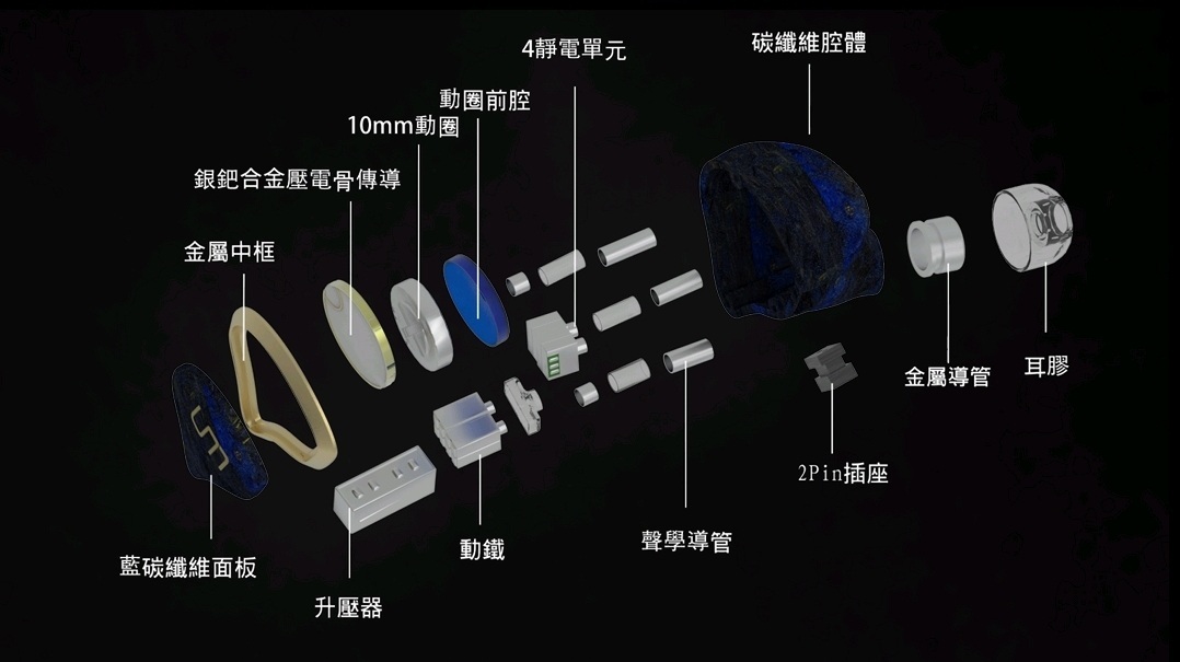 4種單元組合,動圈負責低頻,動鐵負責中⾼頻,兩對靜電單元負責超⾼頻,銀鈀合⾦壓電⻣傳導則提供全頻率補償。